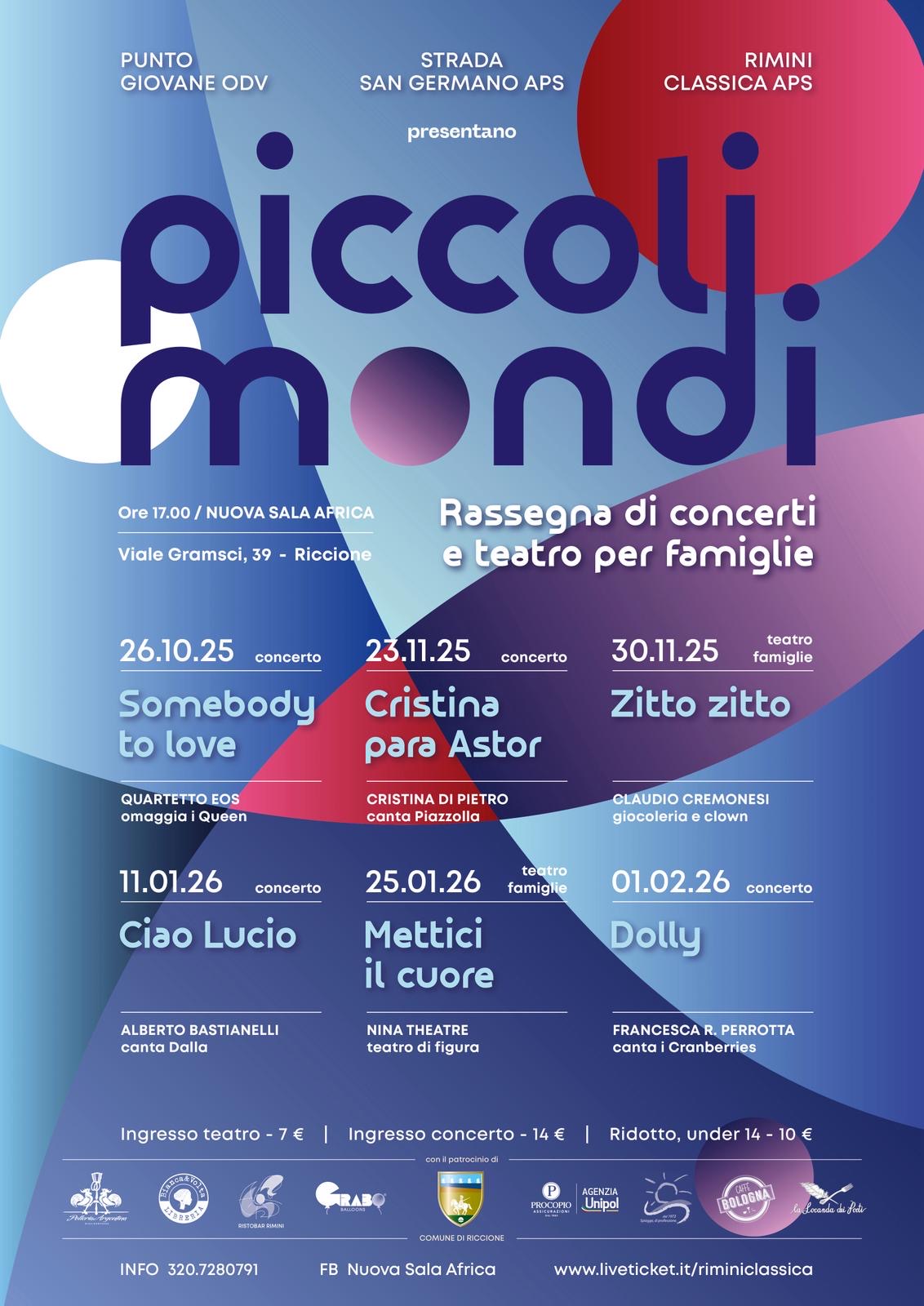 Il 26 ottobre si è alzato il sipario sulla quarta edizione di "Piccoli Mondi", la rassegna musicale e teatrale che ha inaugurato la Nuova Sala Africa (Viale Gramsci 39). L'evento è stato organizzato dalle associazioni Rimini Classica Aps, Strada San Germano Aps e Punto Giovane Odv di Riccione, con il patrocinio del Comune di Riccione.