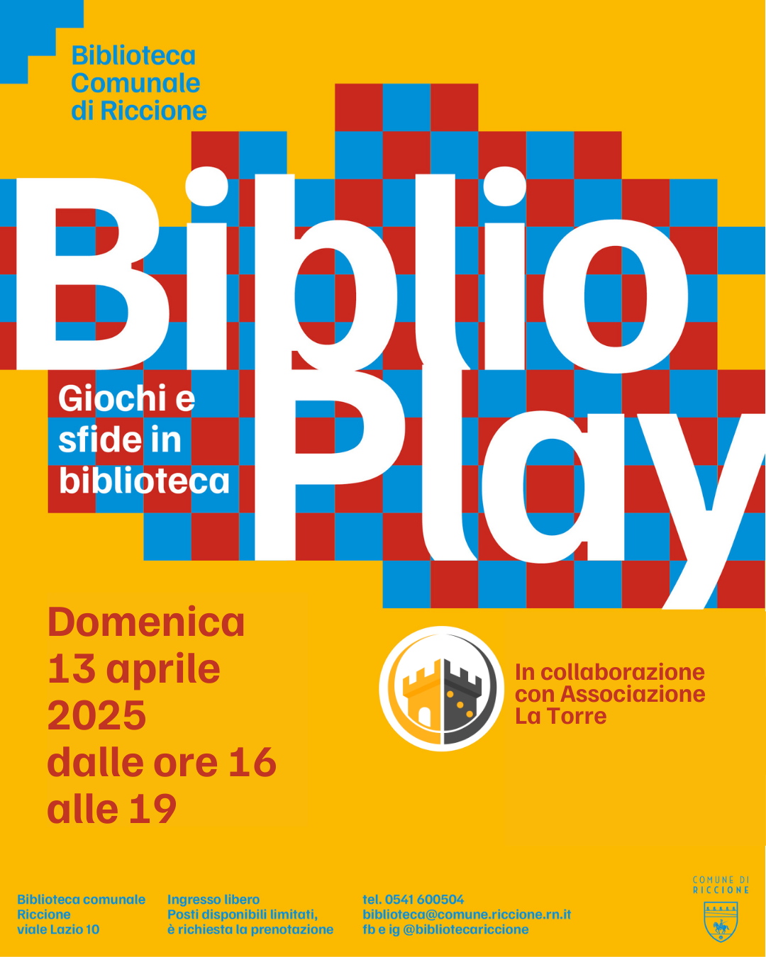 L’ingresso è libero e i posti disponibili sono limitati: visto il successo dell’appuntamento precedente di “Biblioplay” è richiesta la prenotazione, scrivendo all’indirizzo biblioteca@comune.riccione.rn.it oppure telefonando al numero 0541 600504.
