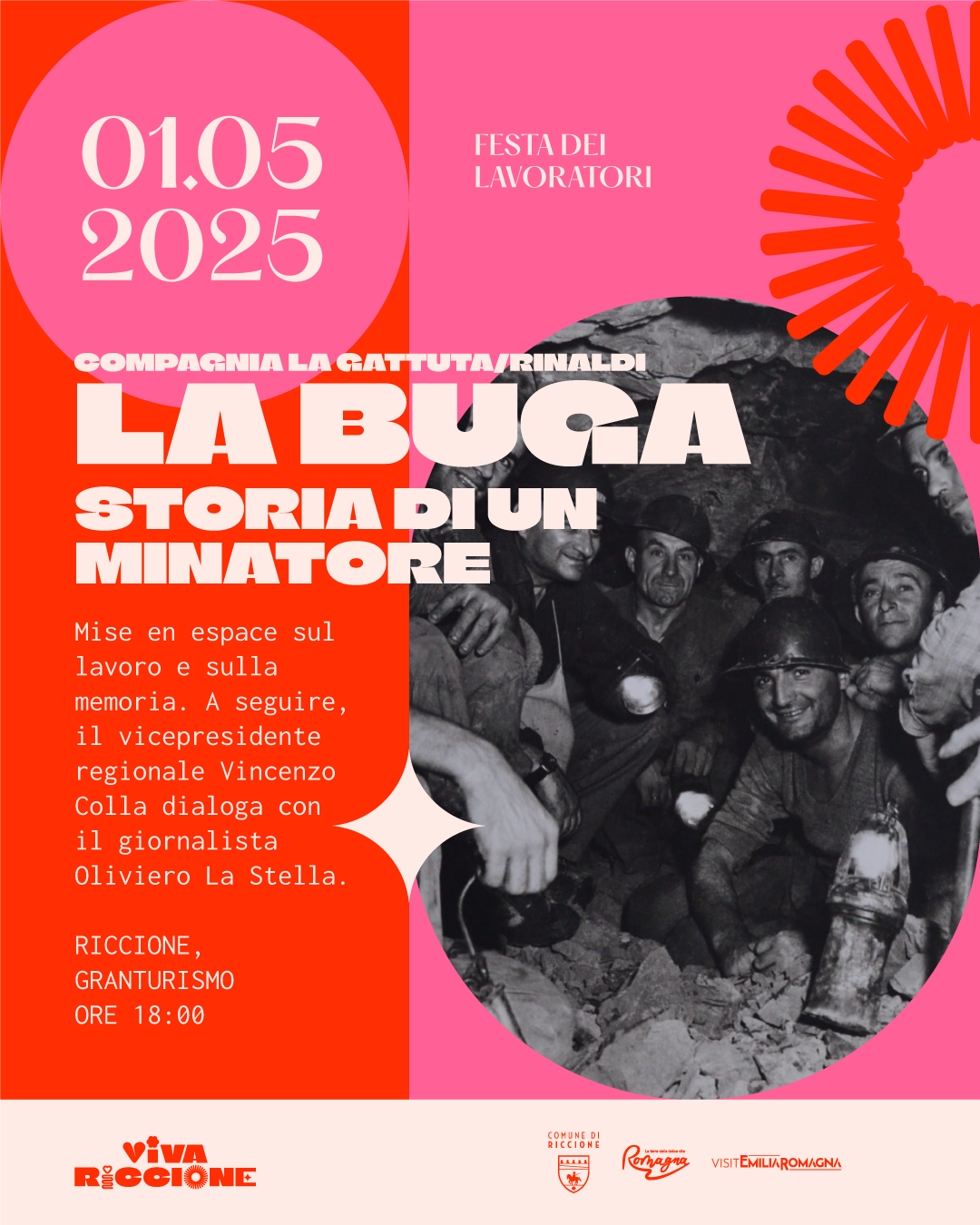 Il primo maggio, Riccione propone un doppio evento dedicato al mondo del lavoro. Alle 18, alla Granturismo, la compagnia Rinaldi/La Gattuta presenterà La Buga – Storia di un minatore, studio per uno spettacolo teatrale che esplora il tema del lavoro e delle sue implicazioni sociali ed economiche, attraverso la storia della miniera di zolfo di Perticara, la più grande d’Europa, attiva fino al 1964, riportando alla luce una parte spesso dimenticata della storia del lavoro in Italia.