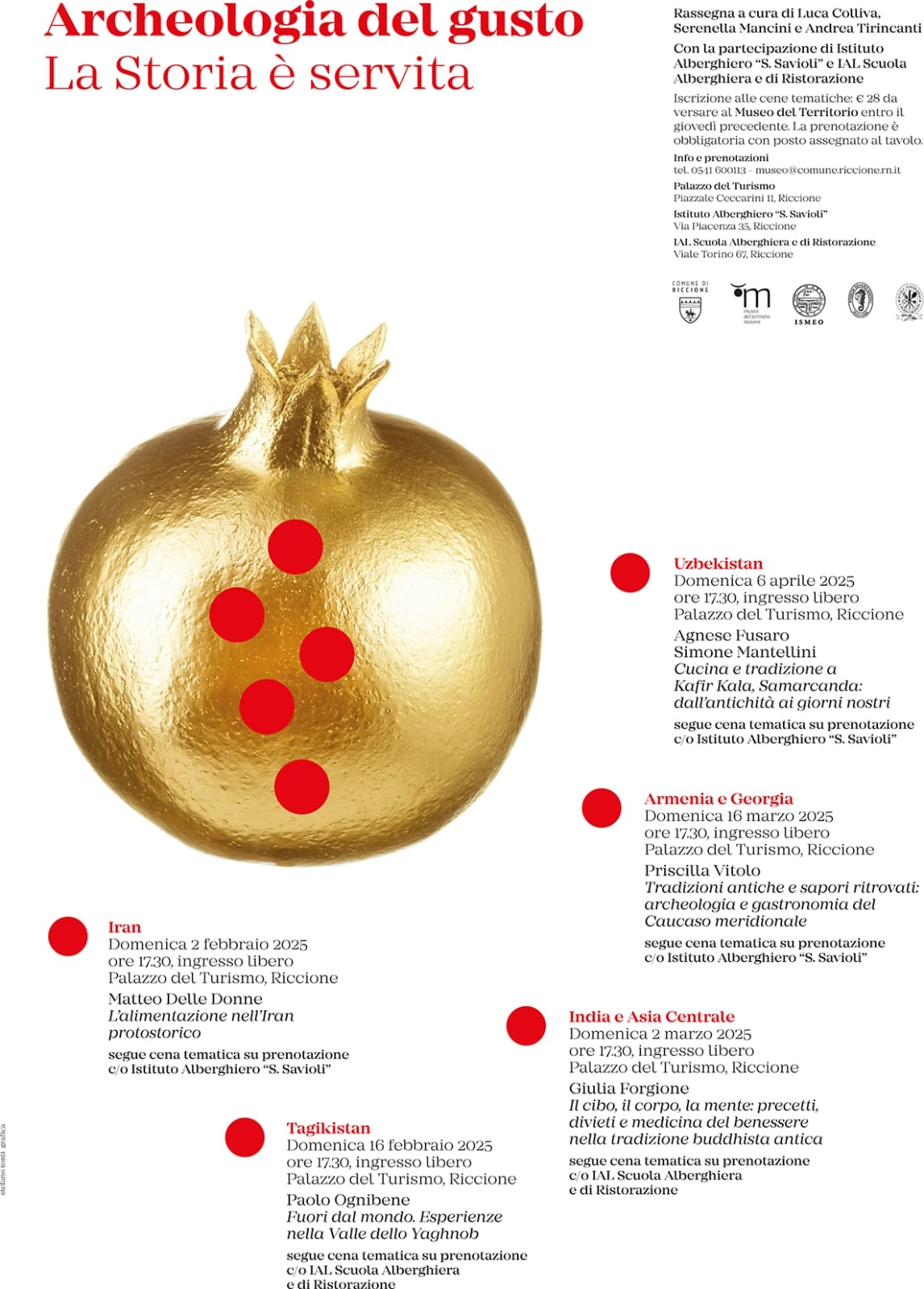 Quest’anno la rassegna culturale, giunta alla sesta edizione, intraprenderà un viaggio in cinque puntate alla scoperta della cultura, della storia e delle abitudini in tavola dell’Asia. Il percorso straordinario si snoderà dall’Iran al Tagikistan, dall’India e dall’Asia centrale all’Armenia e Georgia fino all’Uzbekistan. La rassegna, come sempre, comprenderà un momento di approfondimento storico-culturale insieme a illustri storici e ricercatori e un momento conviviale con le cene a tema realizzate dagli allievi e insegnanti dell’Istituto alberghiero S. Savioli e, quest’anno per la prima volta, dallo Ial-Scuola alberghiera e di ristorazione di Riccione.