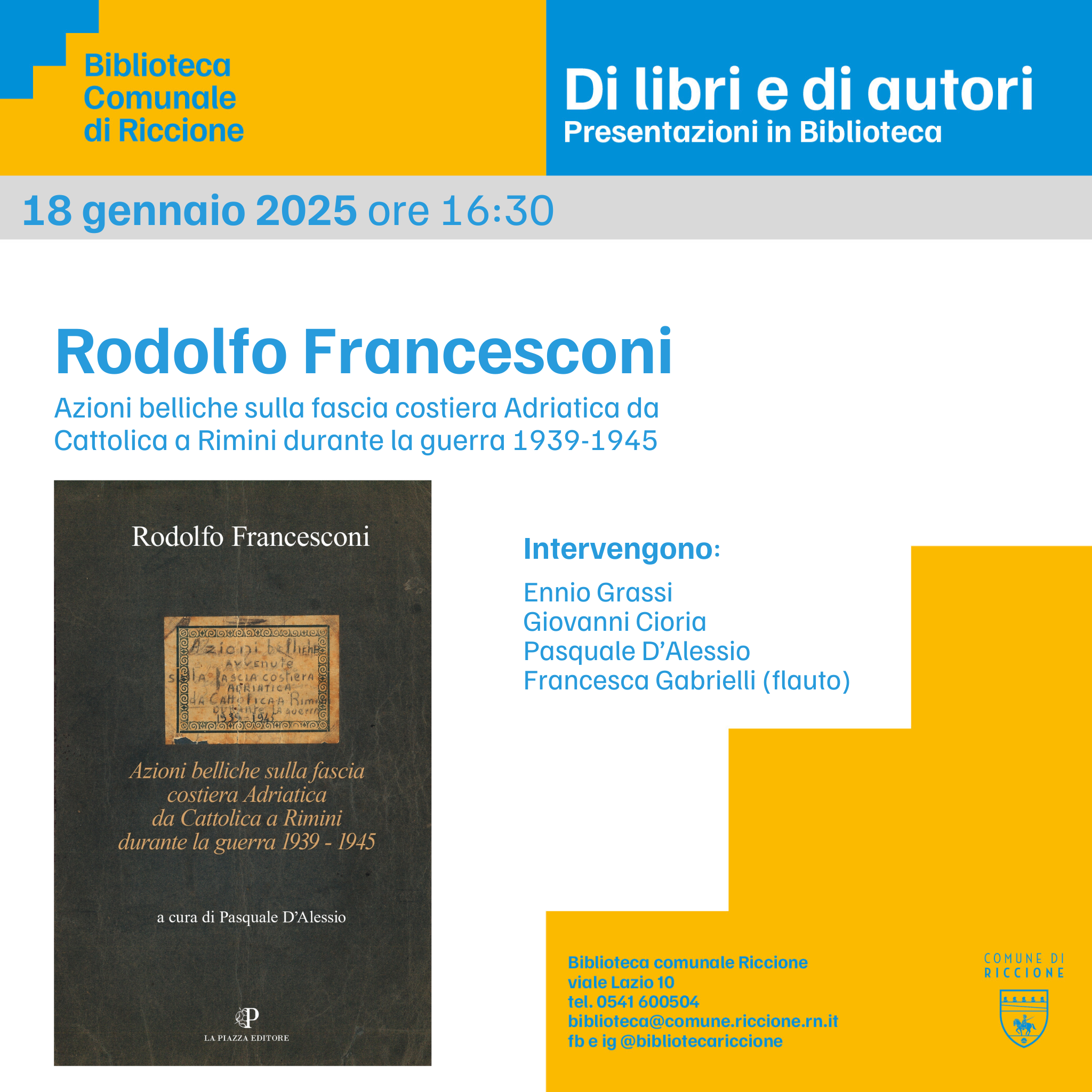 Il libro di Rodolfo Francesconi è dedicato all’amico e artista riccionese Roberto De Grandis, scomparso nel dicembre del 2023. All’incontro pubblico interverranno diverse personalità e autori della cultura locale come il saggista e scrittore Ennio Grassi, il direttore de “La Piazza” Giovanni Cioria e il poeta Pasquale D’Alessio con l’accompagnamento musicale di Francesca Gabrielli al flauto. Il libro è stato stampato con il contributo di Geat. L’iniziativa, a ingresso libero, gode del patrocinio del Comune di Riccione.