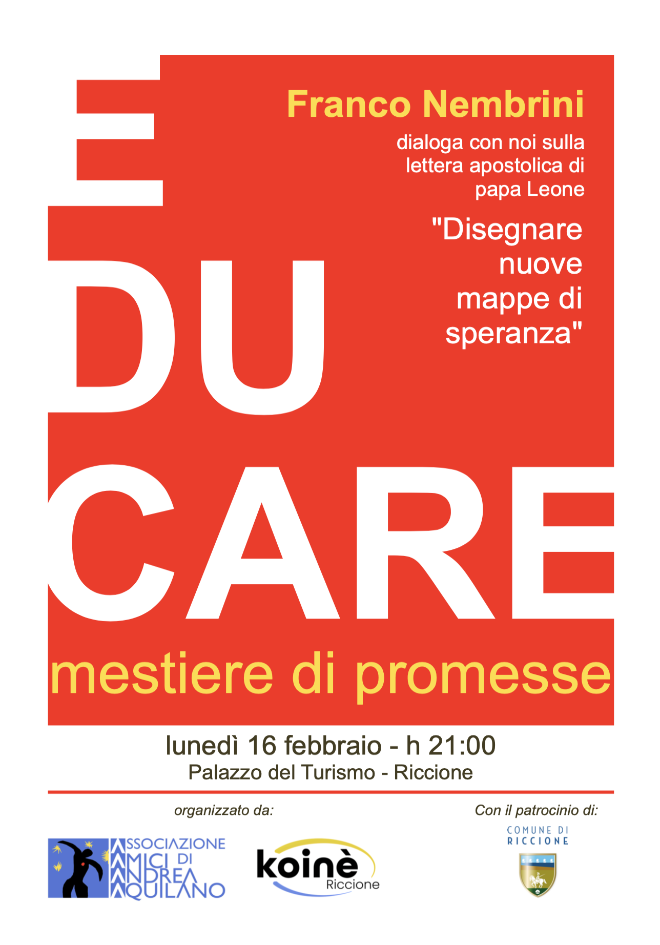 Il tema dell’educazione come pilastro della società contemporanea sarà al centro dell’incontro pubblico in programma lunedì 16 febbraio alle 21 al Palazzo del Turismo, organizzato dall’associazione Amici di Andrea Aquilano e patrocinato dal Comune di Riccione.