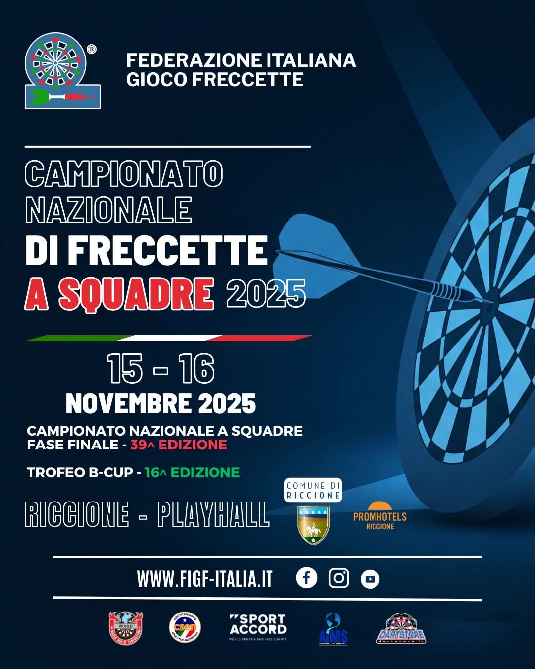 A partire da sabato 15 novembre, alle ore 10, ben 36 squadre provenienti da gran parte delle regioni italiane si sfideranno per conquistare il prestigioso titolo di Campione d’Italia e il pass per la Champions League di freccette.