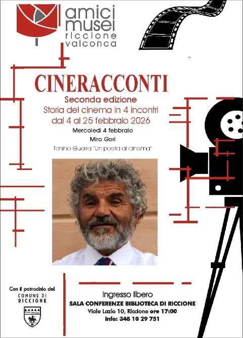 Prende il via mercoledì 4 febbraio la rassegna “Cineracconti”, il ciclo di incontri organizzato e presentato dall’associazione Amici dei Musei di Riccione e Valconca. Il progetto nasce per esplorare le trame che legano il cinema alla storia, alla letteratura e ai suoi grandi protagonisti, con l’obiettivo di promuovere la conoscenza della settima arte attraverso il racconto di fatti, aneddoti e curiosità arricchiti da immagini.
