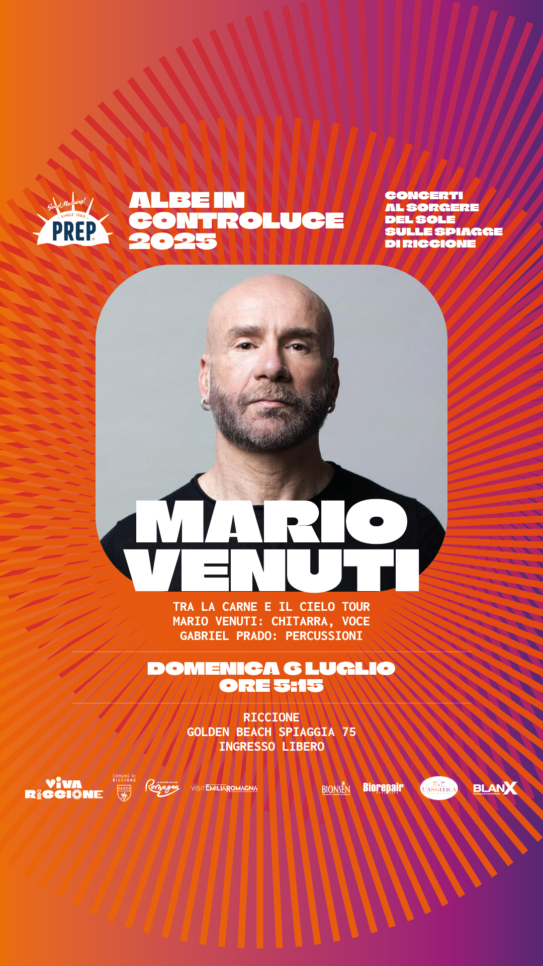 Dopo la straordinaria interpretazione in danza e musica con Kledi e Syria all’alba della Notte Rosa, il tour musicale itinerante sulla spiaggia di “Albe in controluce” prosegue domenica 6 luglio (ore 5:15, spiaggia 75 Golden Beach) con il cantautore Mario Venuti, che presenta a Riccione il suo live “Tra la carne e il cielo”: un concerto intimo di chitarra e voce, impreziosito dalle leggere e colorate percussioni di Gabriel Prado. Con questo concerto, il pubblico avrà l’opportunità di riscoprire i grandi successi che hanno definito la carriera dell’artista, di farsi trasportare dai ricordi con le cover delle grandi canzoni italiane e di apprezzare i brani tratti dal suo ultimo album: da “Napoli-Bahia”, il primo singolo uscito a maggio del 2023, a “Degrado”, l’ultimo brano che ha accompagnato l’uscita del nuovo disco.