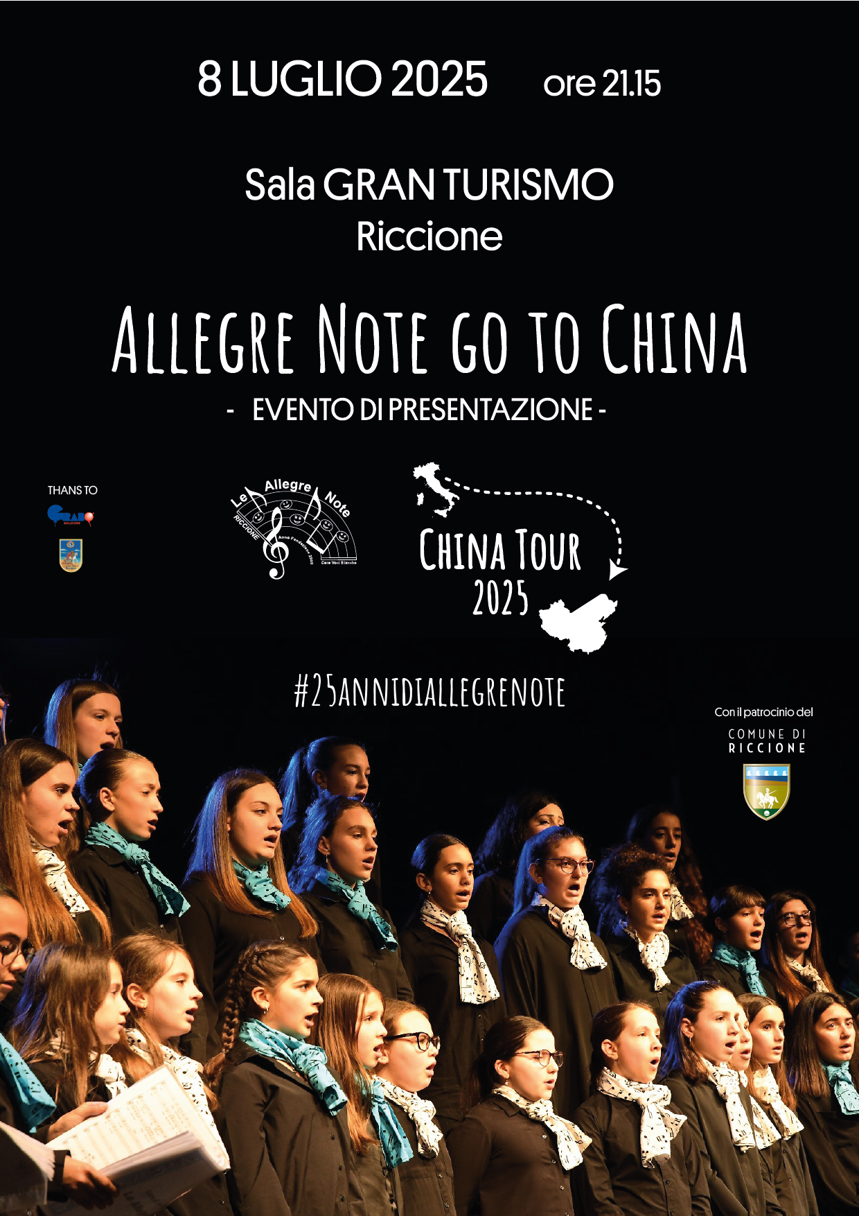 La tournée delle Allegre Note è patrocinata dal Ministero della Cultura Cinese e organizzata su segnalazione di direttori d’orchestra e solisti con cui il coro ha collaborato a lungo nel corso degli anni. Un ulteriore riconoscimento della solida reputazione che il gruppo riccionese ha saputo costruire, non solo in Italia, ma anche a livello internazionale. Dopo le prime tappe nelle metropoli di Pechino e Shanghai, il tour proseguirà in alcuni tra i più prestigiosi teatri delle città di Shijiazhuang, Yantai, Qingdao, Nanchang, Dalian, Mudanjiang e Changchun.