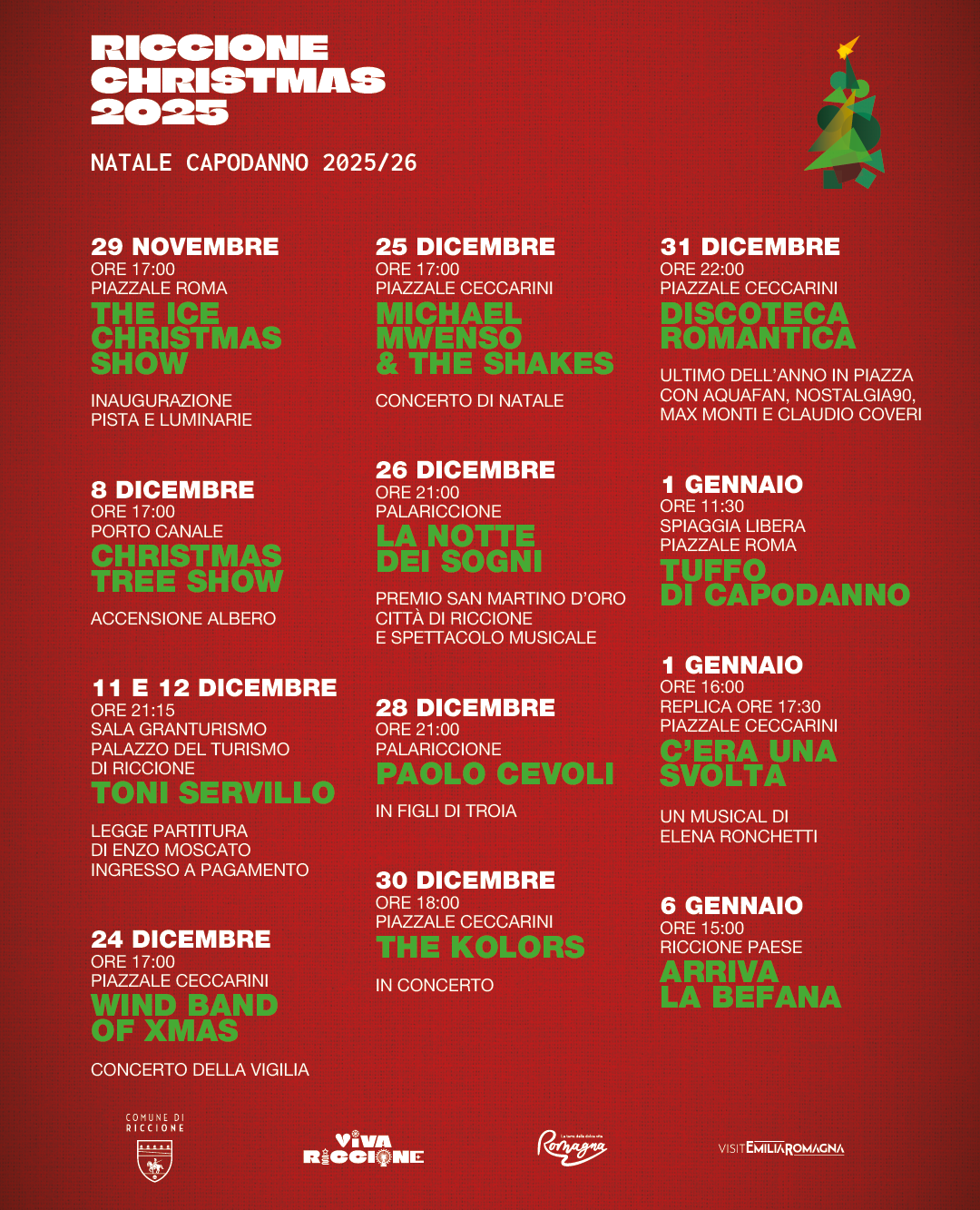 Riccione si prepara a vivere un inverno scintillante e un periodo di feste che si annuncia tra i più ricchi e spettacolari. Dal 29 novembre al 6 gennaio, il nuovo progetto "Viva Riccione - Il tuo Natale al mare" conferma la Perla verde come capitale dell'intrattenimento, con un palinsesto tutto da vivere tra spettacoli di alto livello, meravigliose luminarie -- da quest'anno anche sul lungomare -- la bellissima pista di pattinaggio sul mare e la ruota panoramica. L'atmosfera del Natale si intreccia con la vivacità che da sempre contraddistingue la città, dando vita a un calendario di eventi imperdibili per tutti.
