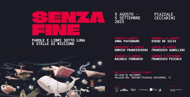 Torna nei mesi di agosto e settembre a Riccione in piazzale Ceccarini la seconda edizione di Senza fine, rassegna promossa dal Comune di Riccione e dedicata ai libri e ai loro autori. Il titolo della manifestazione si ispira alla celebre canzone di Gino Paoli, Senza fine, un brano che canta l’amore come un sentimento che sfugge ai limiti del tempo, che non si esaurisce ma si rinnova continuamente. Allo stesso modo, il legame tra chi scrive e chi legge, tra parola e ascolto, è una relazione viva, mutevole, ma capace di attraversare le stagioni della vita restando sempre generativa.