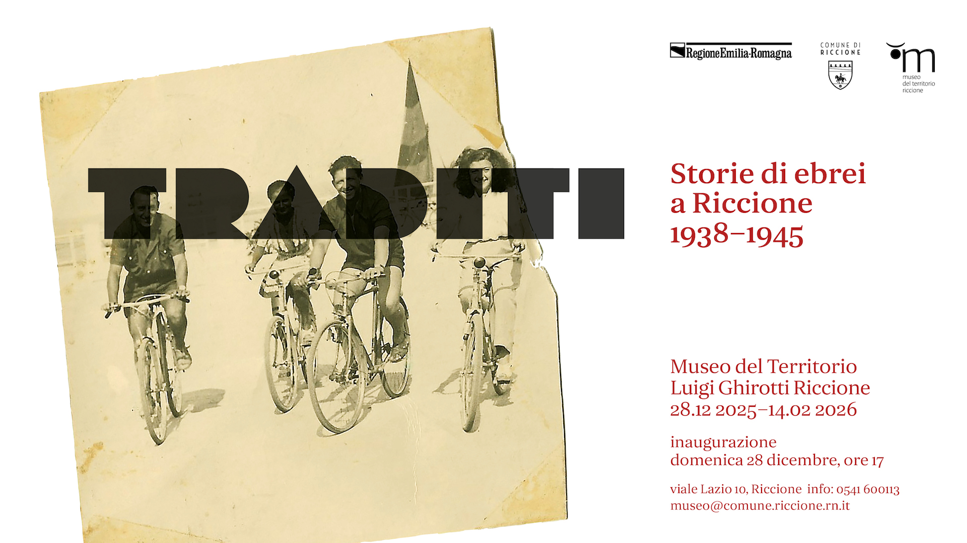 Curata da Daniel Degli Esposti e Andrea Tirincanti, la mostra è realizzata grazie al finanziamento regionale previsto dal bando Memoria del Novecento L.-R. 3/2016, dedicato a iniziative volte a valorizzare la memoria e la storia del Novecento in Emilia-Romagna. Le storie di “Traditi. Storie di ebrei a Riccione 1938–1945”saranno approfondite anche attraverso un podcast, realizzato nell’ambito delle azioni legate alla memoria del Novecento. Al progetto partecipano, in qualità di partner, i Comuni di Misano Adriatico e San Clemente, la Biblioteca di Misano Adriatico, la Fototeca e la Biblioteca di Riccione.