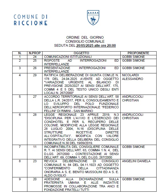Il Consiglio Comunale è convocato presso la Civica Residenza, alla pubblica seduta del giorno martedì 20 maggio 2025, alle ore 20:00, per la trattazione degli argomenti presenti nell'ordine del giorno.