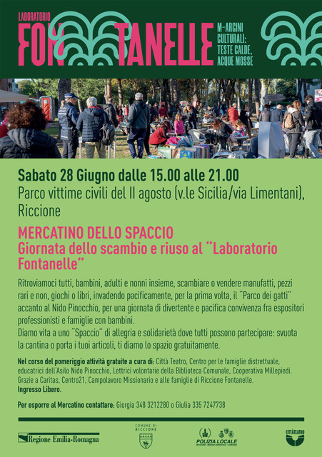 Sono aperte le prenotazioni per partecipare al “Mercatino dello Spaccio - Giornata dello Scambio e del Riuso”, in programma sabato 28 giugno dalle ore 15.00 alle 21.00 presso il Parco Vittime Civili del II Agosto (viale Sicilia / via Limentani), nel cuore del quartiere Fontanelle.