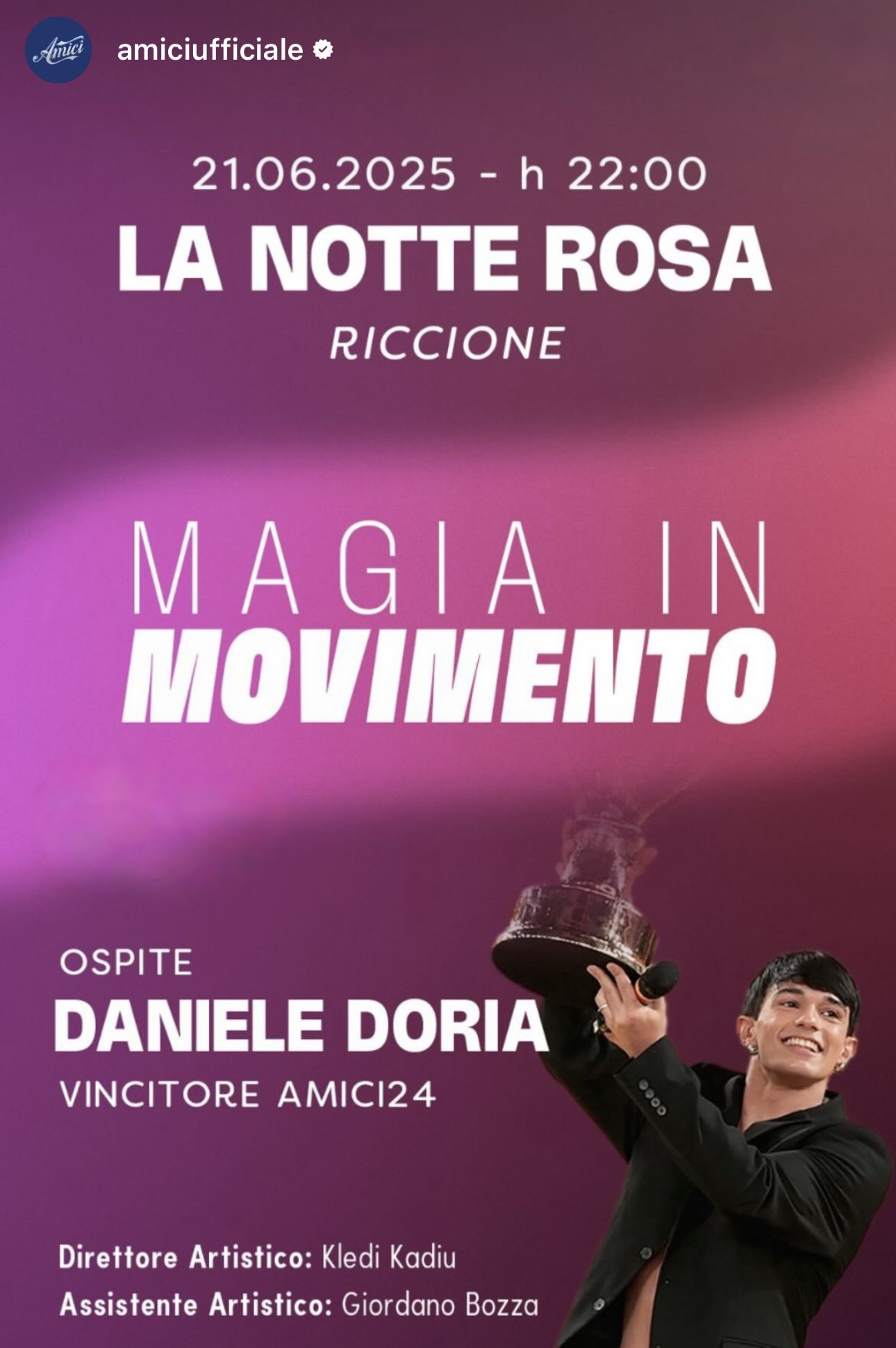 Magia in movimento l’appuntamento in programma per La Notte Rosa di Riccione sabato 21 giugno, si arricchisce di un nuovo nome: il Gran gala della danza, diretto da Kledi Kadiu, vedrà tra i danzatori presenti Daniele Doria, vincitore di Amici 24.