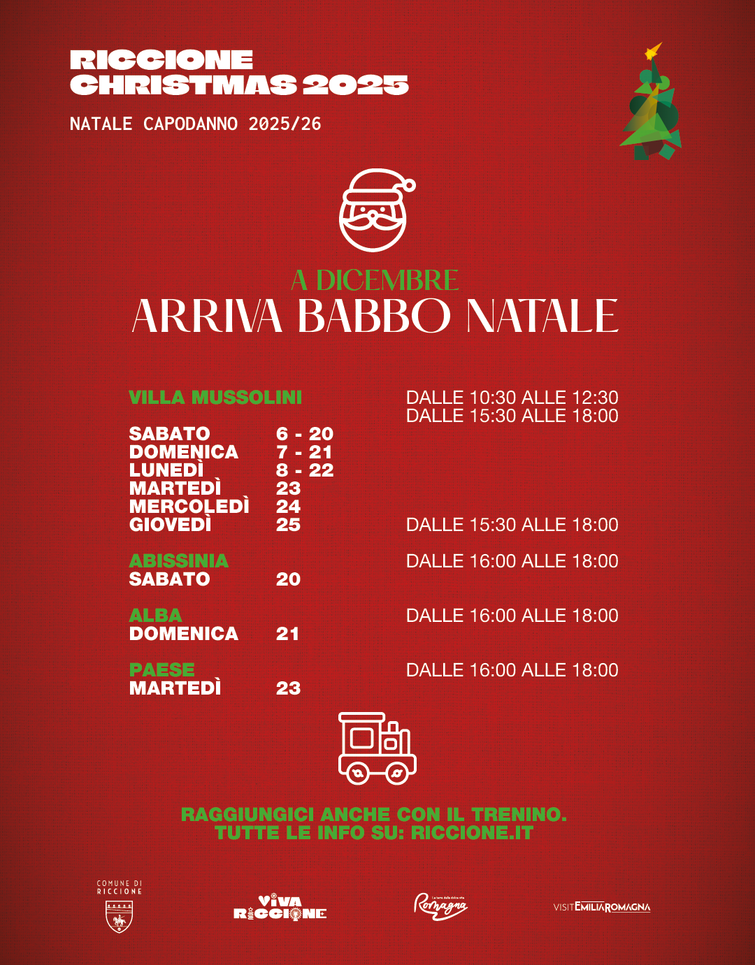 Sabato 20 dicembre, in occasione delle iniziative a cura del Comitato Riccione Abissinia, Babbo Natale farà visita ai bambini in piazzale San Martino, dove sarà presente per foto, saluti e momenti di festa. Ad accoglierlo, ci saranno band dal vivo con canti e atmosfere natalizie, pronte a trasformare il pomeriggio in un piccolo evento da vivere insieme. La festa proseguirà fino alle 19:30 e sarà accompagnata da una merenda per tutti i bambini.
