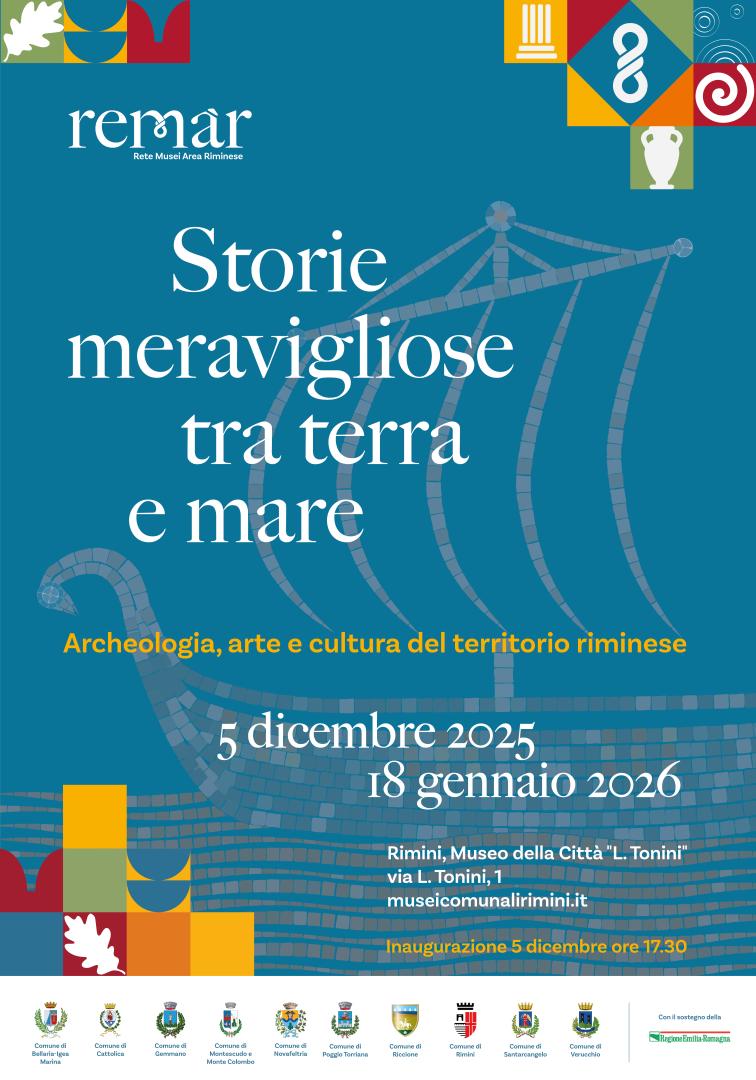 Venerdì 5 dicembre, alle 17:30 al Museo della Città, inaugura “Storie meravigliose tra terra e mare”, la prima mostra di Remàr, la Rete dei Musei di Area Riminese. Nella Sala Teche saranno esposti reperti e testimonianze storico-artistiche provenienti da 23 musei del territorio, tra cui anche Riccione, insieme a Rimini, Bellaria-Igea Marina, Cattolica, Montescudo-Montecolombo, Perticara (Novafeltria), Poggio-Torriana, Santarcangelo di Romagna e Verucchio. Un territorio che si estende tra collina e pianura, fiumi e mare, e che, attraverso le sue molteplici collezioni storiche, archeologiche, etnografiche e artistiche, offre preziose chiavi di lettura per comprendere la storia, le tradizioni e le esperienze di donne e uomini nel corso del tempo.