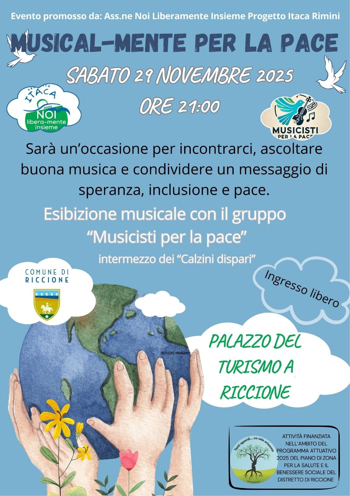 Il Palazzo del Turismo di Riccione si prepara ad accogliere un evento speciale all'insegna della musica, della solidarietà e della pace. Sabato 29 novembre 2025, alle ore 21.00, si terrà il concerto a ingresso libero “Musical-mente per la Pace”, promosso dall’Associazione Noi Liberamente Insieme Progetto Itaca Rimini Odv.