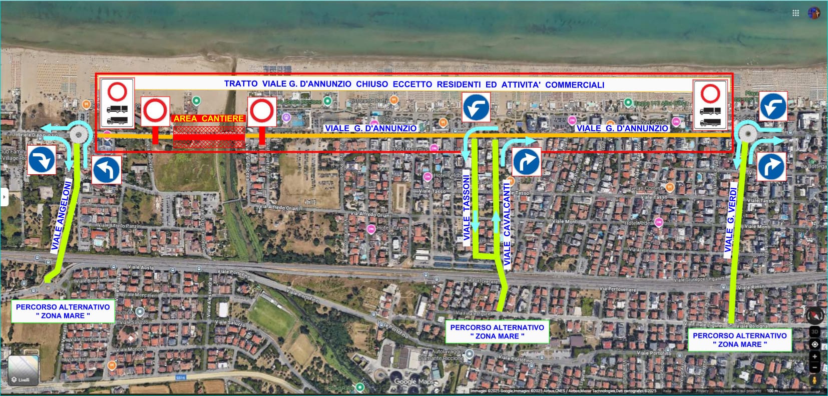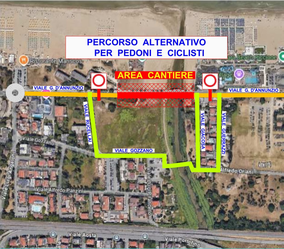 Per chi proviene da Rimini direzione Cattolica, la deviazione obbligatoria prevede l’ingresso in viale Angeloni e il proseguimento su viale Portofino.