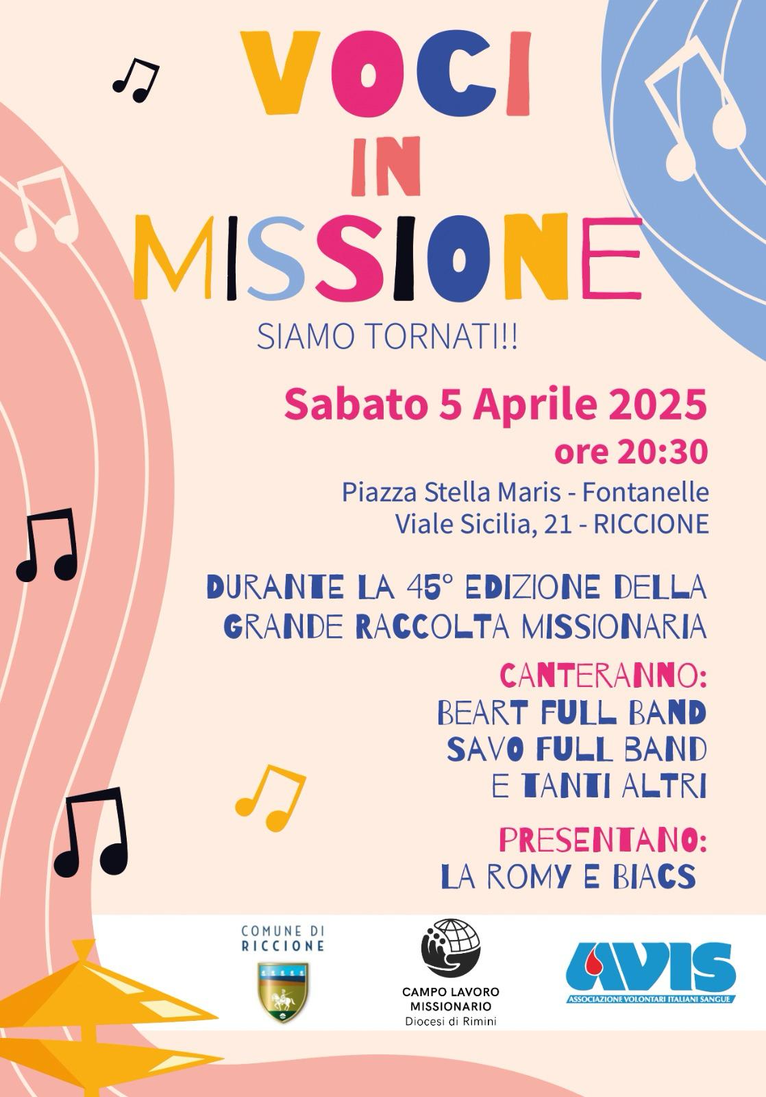 Per festeggiare la comunità e ritrovarsi in un momento conviviale, anche quest’anno il cuore dell’iniziativa sarà rappresentato dalla seconda edizione di "Voci in Missione", una serata musicale che si svolgerà sabato 5 aprile alle ore 20.30 in piazza Stella Maris. Quest’anno, il concerto si arricchisce della collaborazione con Avis Riccione, sottolineando l’importanza della donazione del sangue e il ruolo fondamentale che ogni cittadino può avere nella creazione di un legame di solidarietà. Sarà un momento di incontro, dove i volontari del Campo Lavoro Missionario e la città si ritroveranno per condividere emozioni, allegria e impegno sociale.